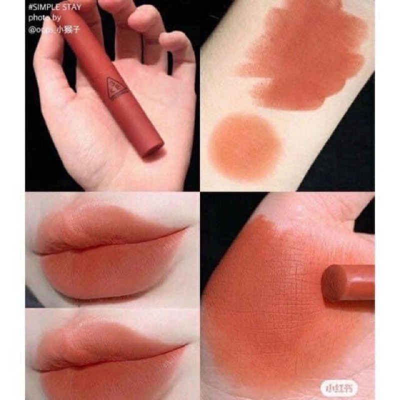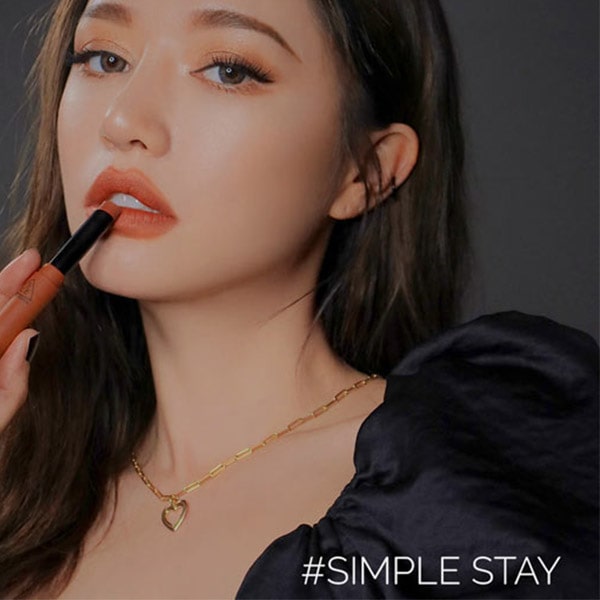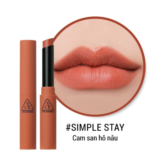 Nếu bạn đang tìm kiếm một sắc son mới mẻ và thanh lịch, 3CE Simple Stay chắc chắn là một lựa chọn không thể bỏ qua! Màu cam nude pha đất của sản phẩm này mang đến sự tươi mới nhưng không quá nổi bật, dễ dàng phù hợp với nhiều tông da khác nhau. Sắc son này giúp tôn lên nét đẹp tự nhiên, tạo cảm giác nhẹ nhàng và thanh thoát cho gương mặt.