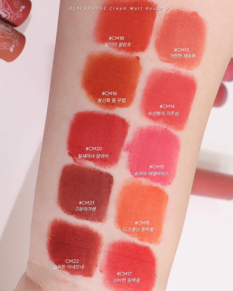 Ngoài ra, dòng son này còn có thêm những màu độc đáo như CM04 – Orion với màu cam đỏ đất trendy, hay CM05 – Delta, một tông đỏ nâu trung tính hiện đại. Chất son mềm mịn, dễ tán và đặc biệt là khả năng lên màu chuẩn, khiến Black Rouge Creamy Matt Rouge trở thành sản phẩm không thể thiếu trong bộ sưu tập của các cô nàng hiện đại.