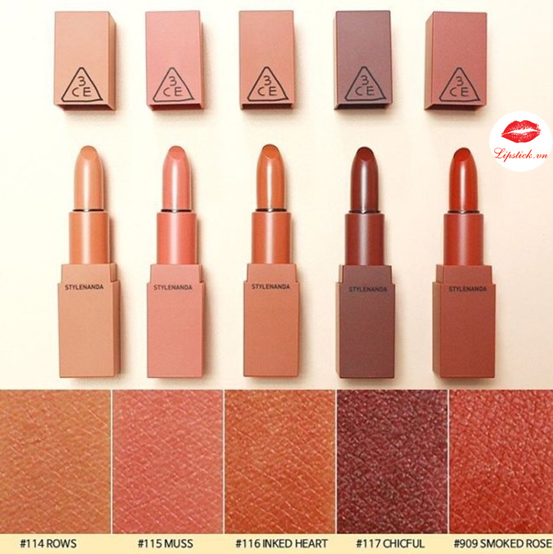 Cuối cùng, đừng quên tham khảo bảng màu đa dạng của 3CE. Mỗi màu son đều có nét đẹp riêng, chỉ cần bạn chọn đúng tông là đã có thể tự tin tỏa sáng.