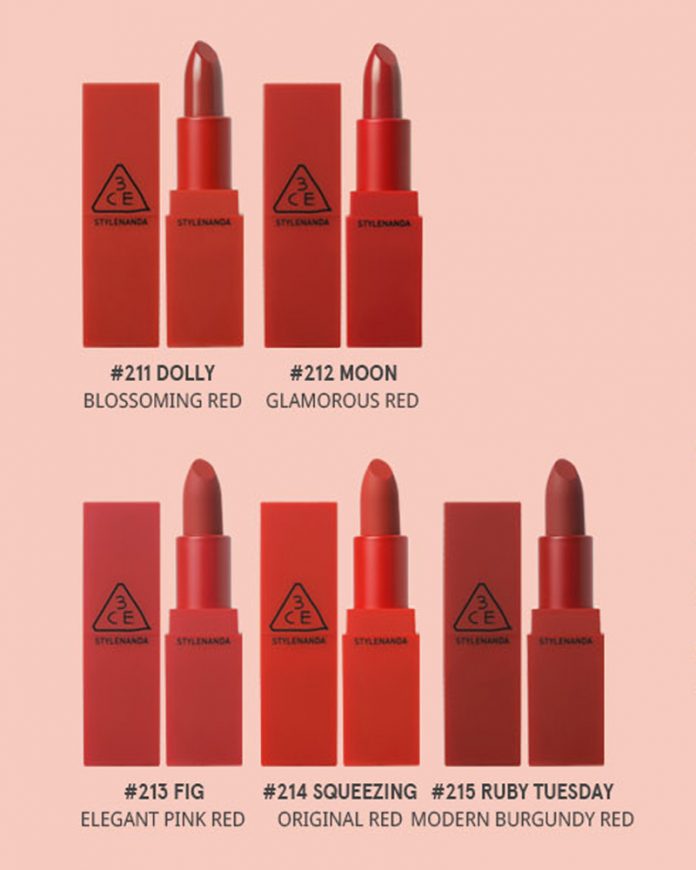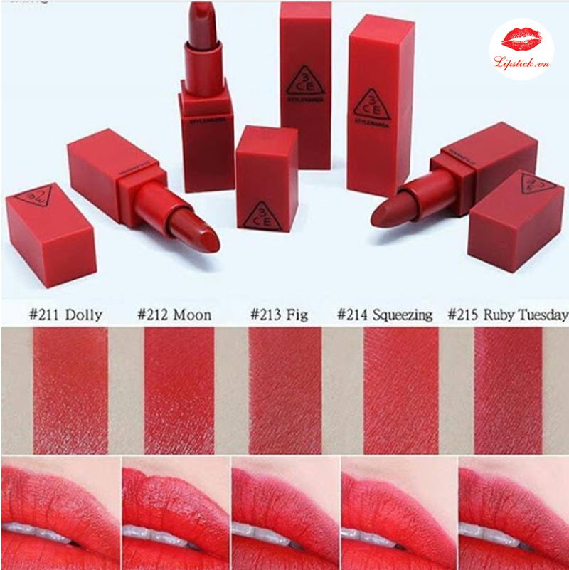 Không chỉ có tông màu tự nhiên, 3CE còn cho ra mắt rất nhiều sắc thái đậm đà như màu cam đào, đỏ cổ điển hay hồng đất lạnh, giúp bạn dễ dàng lựa chọn theo sở thích. Với mức giá khoảng 350.000 VND, đây thực sự là một sản phẩm đáng đầu tư cho bộ sưu tập mỹ phẩm của bạn.