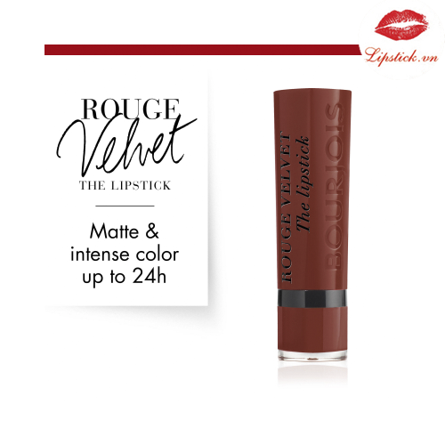 Son Bourjois Velvet 12 Brunette là một sự lựa chọn tuyệt vời cho những cô nàng yêu thích sự cá tính. Sự hòa quyện giữa sắc nâu mạnh mẽ và sắc đỏ ấm áp đem đến một diện mạo vừa nổi bật lại vừa tinh tế. Chất son mịn màng, không hề gây ướt dính, khô ngay sau 5 phút lên môi, tạo cảm giác như bạn đang phủ một lớp nhung mềm mại.