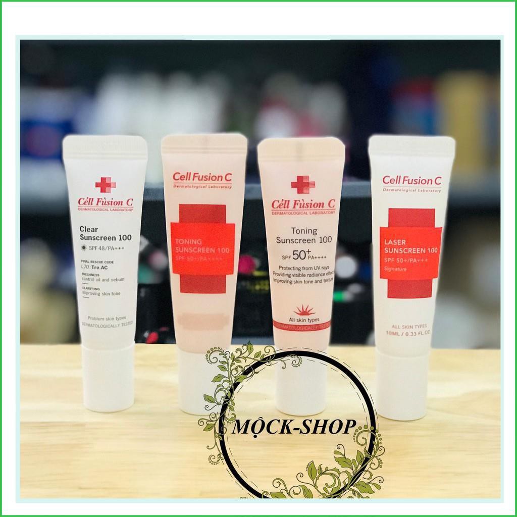 Kem chống nắng Cell Fusion C Toning Sunscreen 100 SPF50+/PA++++ được thiết kế riêng cho làn da dầu, mụn và có nhiều khuyết điểm. Với thành phần chứa AHA và BHA, sản phẩm giúp loại bỏ tế bào chết, mang lại làn da sạch sẽ và mịn màng. Đặc biệt, giá 85.000₫ cho kích thước mini 10ml rất hợp lý cho mọi đối tượng.