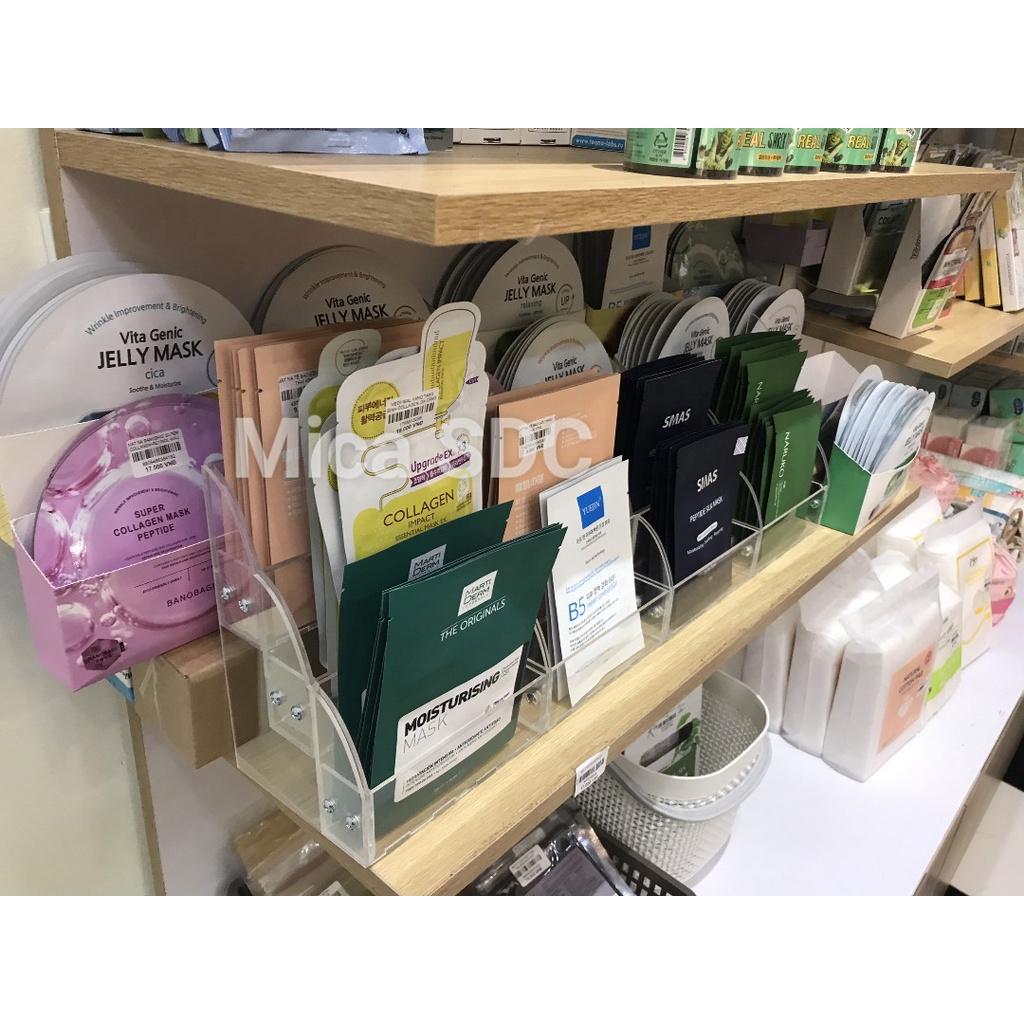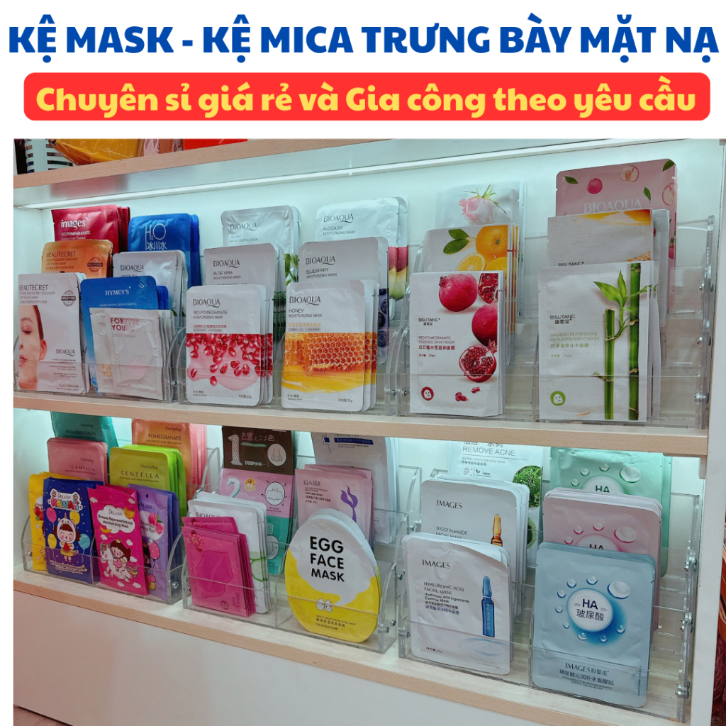 Đặc biệt, kệ mica đựng mặt nạ không chỉ gọn gàng mà còn tiết kiệm diện tích sử dụng, phù hợp cho cả những cửa hàng nhỏ. Bên cạnh đó, kệ còn là một cách để thu hút sự chú ý của khách hàng ngay khi họ bước vào cửa hàng. Các sản phẩm được bảo vệ tốt, giữ nguyên màng bảo vệ chống trầy xước, giúp giữ gìn chất lượng của mặt nạ.
