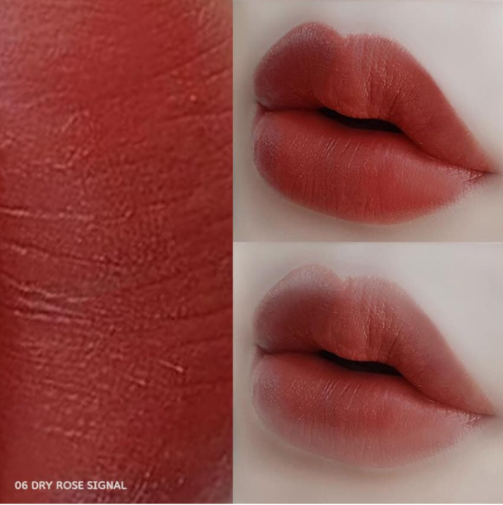 Điểm đặc biệt của màu 06 Dry Rose Signal là sự pha trộn tuyệt vời giữa các tông màu đỏ, cam và nâu. Đây là sự lựa chọn hoàn hảo cho các bạn gái yêu thích sự nhẹ nhàng nhưng vẫn nổi bật. Màu son này rất dễ sử dụng, phù hợp với nhiều kiểu trang điểm và không kén da.