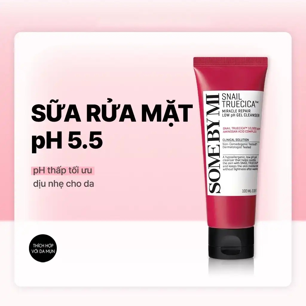 Sữa rửa mặt Some By Mi Snail Truecica Miracle Repair Low pH là một sản phẩm nổi bật trong làm đẹp. Với công thức gel nhẹ nhàng, sản phẩm này kết hợp giữa chiết xuất tự nhiên và mucin từ ốc sên, giúp làm sạch da mà không gây cảm giác khô căng. Đặc biệt, độ pH 5.5 được xem là lý tưởng cho làn da nhạy cảm, mang đến cho bạn trải nghiệm rửa mặt thoải mái nhất.