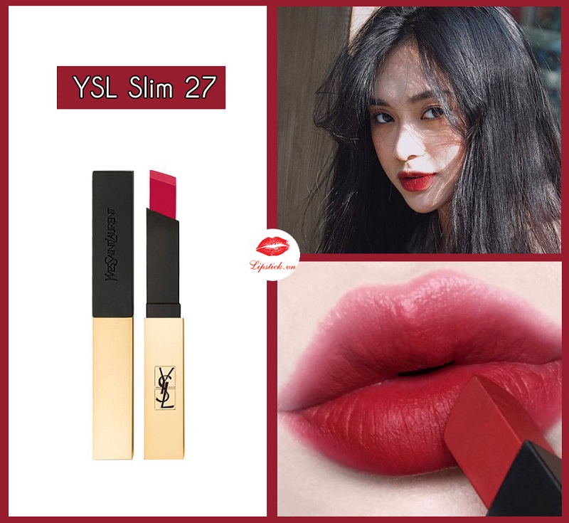 Son YSL 27, hay còn gọi là Rouge Pur Couture The Slim, nổi bật với sắc đỏ đất quyến rũ, mang đến vẻ đẹp mạnh mẽ nhưng không kém phần nữ tính. Chất son bán lì, mịn màng như nhung, giúp bờ môi bạn luôn căng mọng và hút mắt. Đặc biệt, độ bám màu của son rất tốt, giữ màu tươi tắn từ 5 đến 7 giờ, khiến bạn không cần lo lắng khi ra ngoài cả ngày.